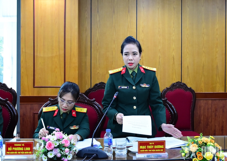 Đại tá Mạc Thùy Dương, Giám đốc Thư viện Quân đội báo cáo công tác chuyển đổi số và nội dung chính của dự án.
