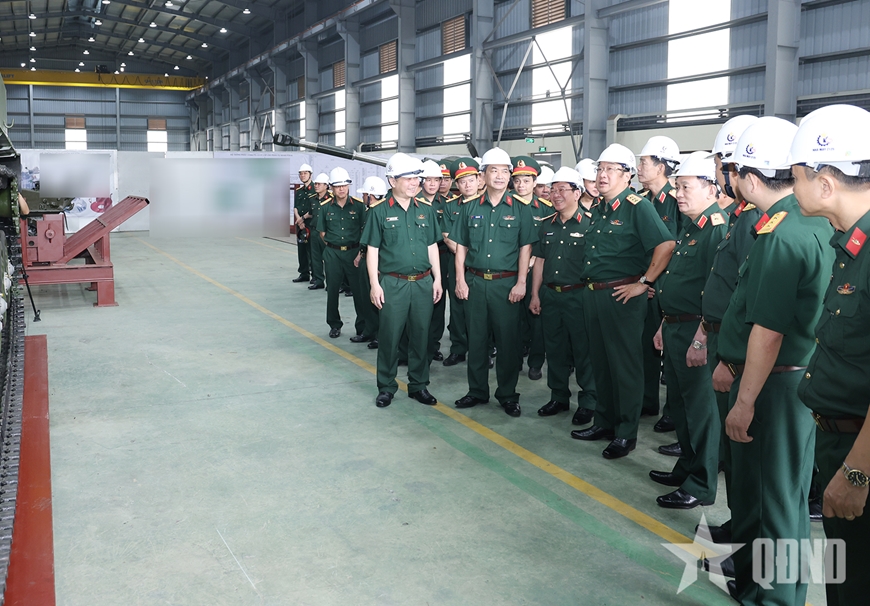 | Thượng tướng Phạm Hoài Nam kết luận kiểm tra tiến độ nghiên cứu, chế tạo xe tăng hạng nhẹ T-1 tại Nhà máy Z125. |