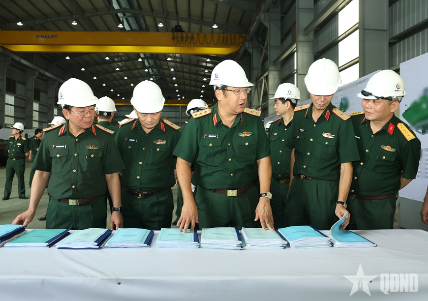 | Thượng tướng Phạm Hoài Nam kiểm tra tiến độ nghiên cứu, chế tạo xe tăng hạng nhẹ T-1 tại Nhà máy Z125. |