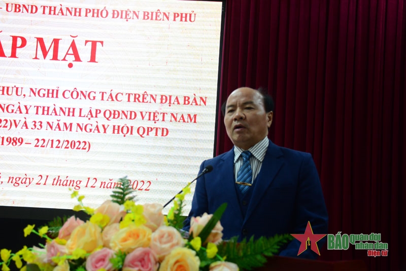 Phát biểu tại buổi gặp mặt, Phó chủ tịch UBND TP Điện Biên Phủ Đào Hoài Nam thông tin những thành tựu nổi bật trong phát triển kinh tế - xã hội của tỉnh và TP Điện Biên Phủ năm 2022. Đồng thời, khẳng định những thành tựu về phát triển kinh tế - xã hội, quốc phòng – an ninh có sự đóng góp tích cực của các cán bộ Quân đội nghỉ hưu, nghỉ công tác trên địa bàn thành phố. Đồng chí Phó chủ tịch UBND TP Điện Biên Phủ nhấn mạnh: Năm 2023 là năm bản lề trong thực hiện kế hoạch phát triển kinh tế - xã hội 5 năm 2021 – 2025 trong điều kiện thuận lợi và khó khăn, thách thức đan xen. Để thực hiện thắng lợi các mục tiêu, nhiệm vụ phát triển kinh tế - xã hội, cùng với quyết tâm của Đảng bộ, chính quyền và nhân dân tỉnh Điện Biên, Thành ủy, HĐND, UBND thành phố mong muốn các cán bộ Quân đội nghỉ hưu, nghỉ công tác trên địa bàn thành phố tiếp tục đóng góp công sức, trí tuệ với cấp ủy, chính quyền cơ sở huy động nguồn lực đẩy nhanh phát triển kinh tế - xã hội, bảo đảm an sinh xã hội; tích cực phối hợp các ngành, các cấp trong công tác tuyên truyền vận động nhân dân thực hiện tốt các chủ trương, đường lối của Đảng, chính sách, pháp luật của Nhà nước và các quy định của địa phương; tích cực tham gia các hoạt động, phong trào ở địa phương góp phần giữ vững an ninh chính trị, trật tự an toàn xã hội trên địa bàn, nhất là dịp diễn ra các sự kiện chính trị trọng đại của Đảng, đất nước và địa phương… (Tin, ảnh: HÀ KHÁNH)