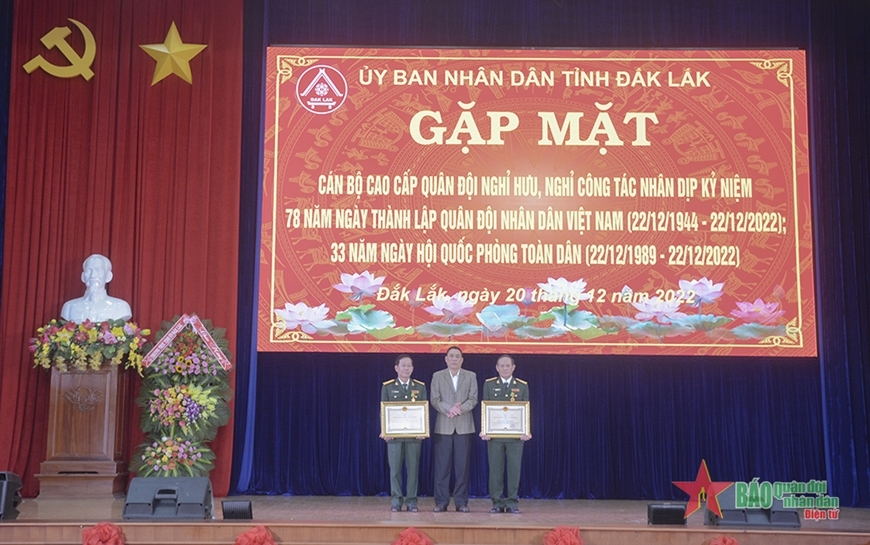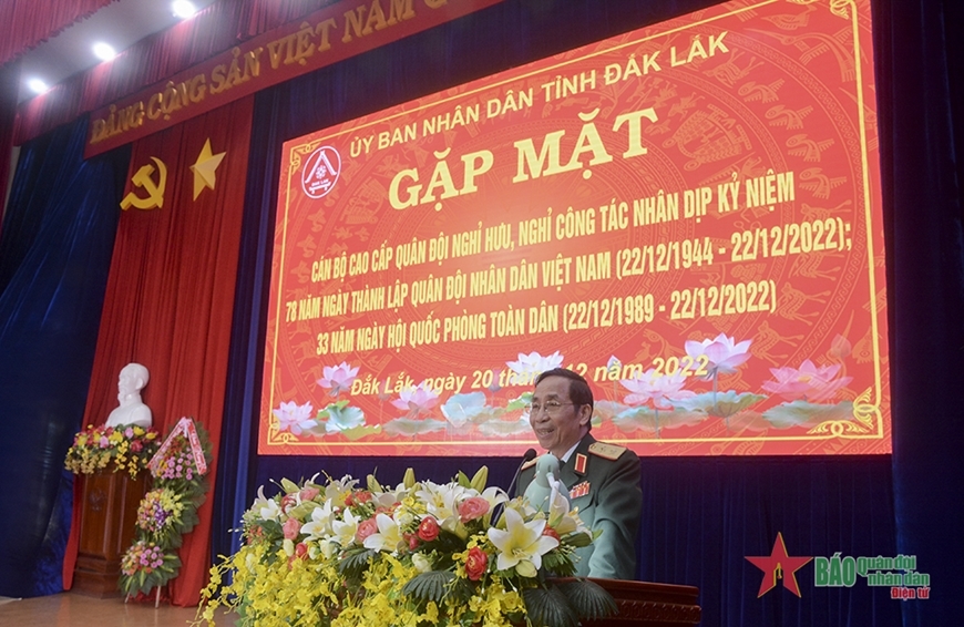 * Ngày 20-12, tại TP Buôn Ma Thuột, UBND tỉnh Đắk Lắk tổ chức gặp mặt cán bộ cao cấp quân đội nghỉ hưu, nghỉ công tác trên địa bàn tỉnh nhân kỷ niệm 78 năm Ngày thành lập Quân đội nhân dân Việt Nam (22-12-1944 / 22-12-2022) và 33 năm Ngày hội Quốc phòng toàn dân (22-12-1989 / 22-12-2022).