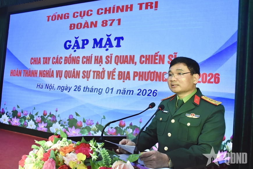 Phát biểu tại buổi chia tay, Đại tá Trần Xuân Lương, Bí thư Đảng ủy, Chính ủy Đoàn 871 biểu dương những nỗ lực, đóng góp của các đồng chí hạ sĩ quan, chiến sĩ hoàn thành nghĩa vụ quân sự trở về địa phương năm 2026.