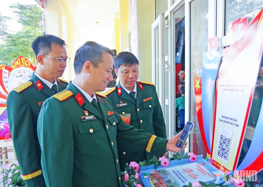 Đại tá Nguyễn Tiến Dũng, Trưởng phòng Công tác quần chúng (Cục Chính trị, Quân đoàn 34) và các đại biểu quét mã QR nhận tài liệu đại hội. |