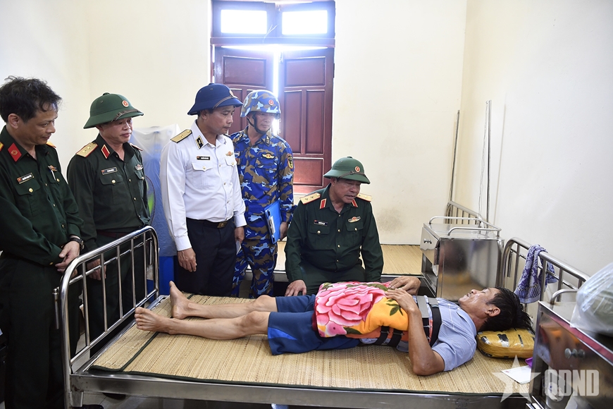 | Đoàn công tác thăm hỏi, động viên người dân bị nạn đang điều trị tại bệnh xá của đảo Trường Sa Đông. |