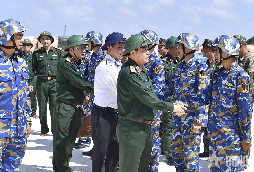 | Thủ trưởng đoàn công tác kiểm tra điều lệnh đội ngũ với cán bộ, chiến sĩ trên đảo Sinh Tồn Đông. |
