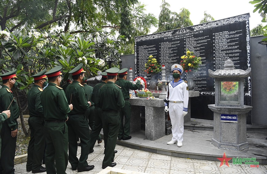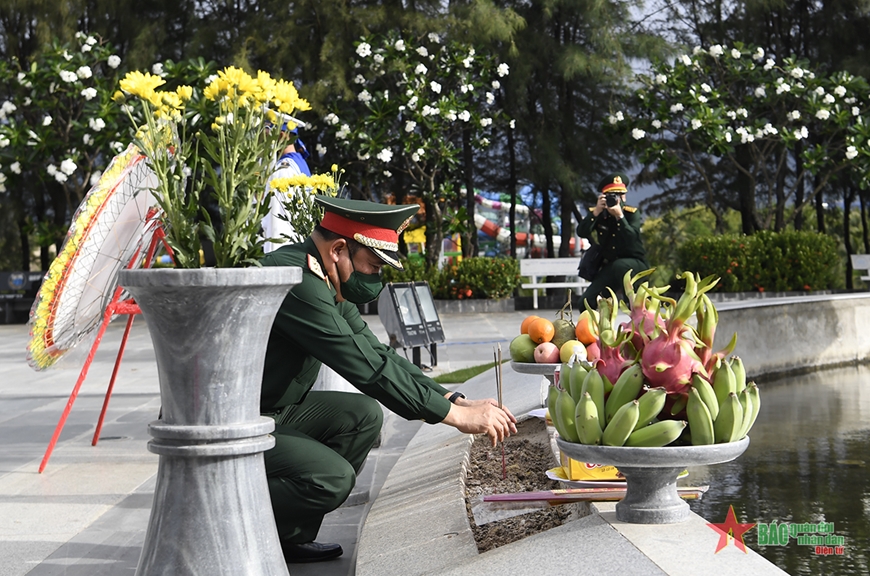 Tiếp sau đó, đoàn đã tới dâng hương tại khu mộ gió nơi ghi danh 64 chiến sĩ Gạc Ma-những người đã hiến dâng cả tuổi thanh xuân của mình cho sự nghiệp bảo vệ Tổ quốc.