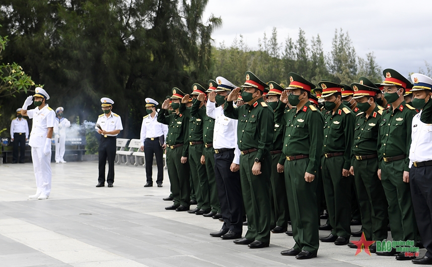 Thành kính tưởng nhớ sự hy sinh anh dũng của các Anh hùng, liệt sĩ hơn 34 năm về trước, Đoàn công tác số 1 dành phút mặc niệm tưởng nhớ 64 chiến sĩ đã hy sinh trên vùng biển Trường Sa.