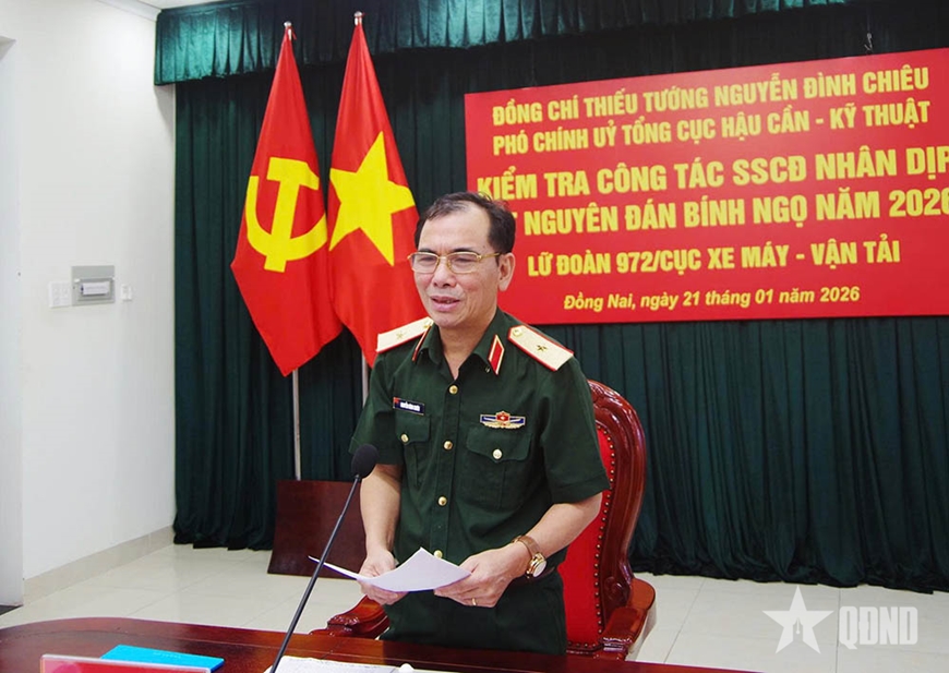 Ngày 21-1, Thiếu tướng Nguyễn Đình Chiêu, Phó chính ủy Tổng cục Hậu cần - Kỹ thuật cùng đoàn công tác đến kiểm tra kết quả thực hiện nhiệm vụ sẵn sàng chiến đấu tại Lữ đoàn 972 (Cục Xe máy - Vận tải) nhân dịp Tết Nguyên đán Bính Ngọ 2026.