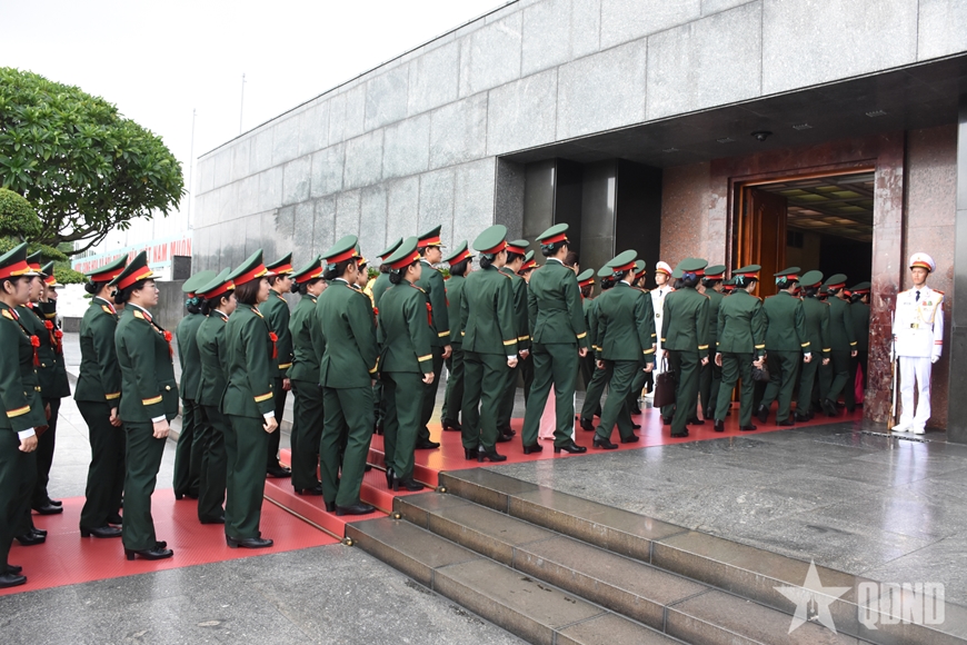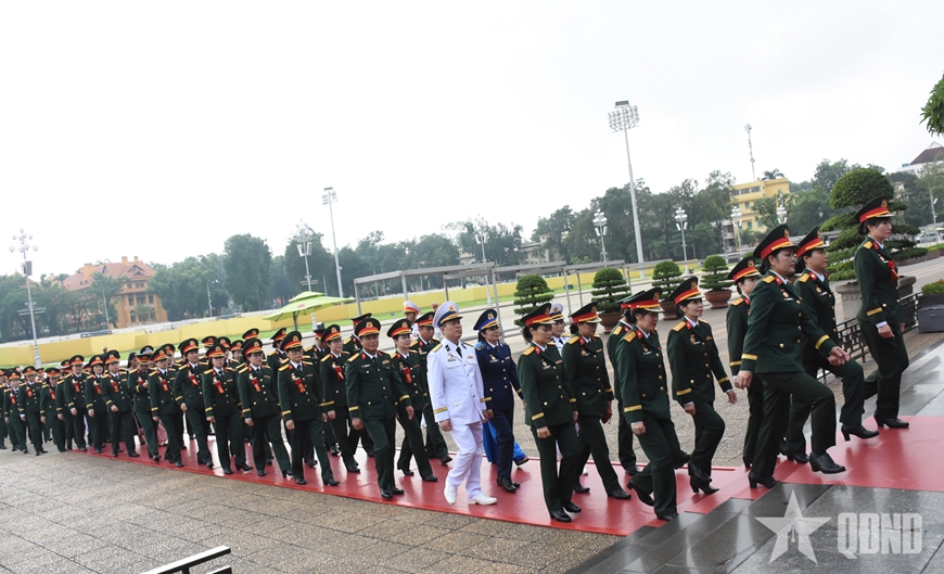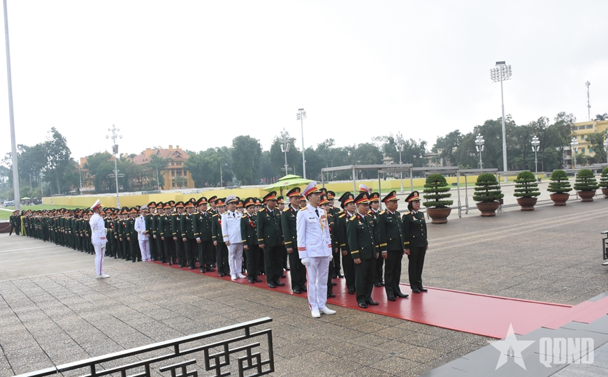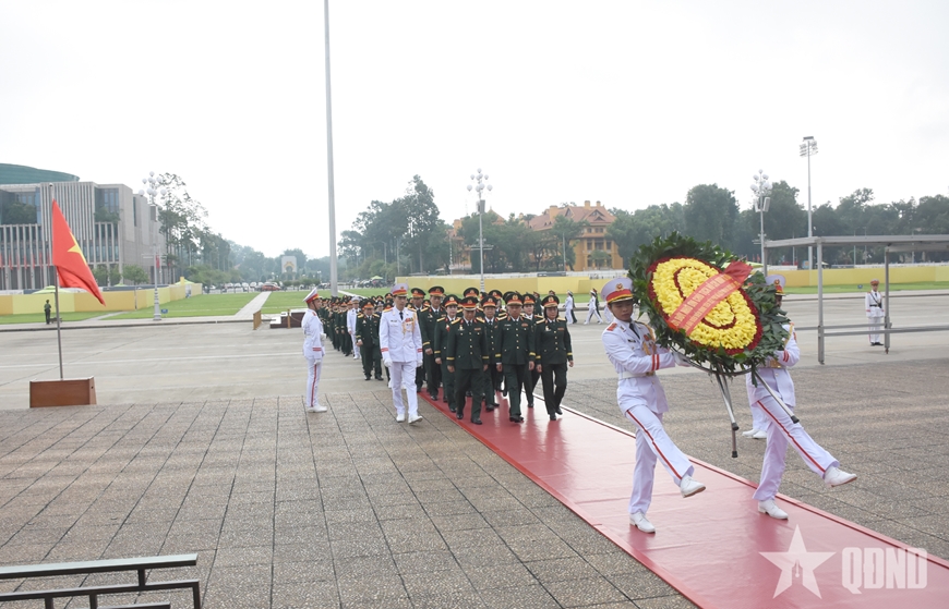 Tiếp đó, trong không khí trang nghiêm, đoàn đã đặt vòng hoa và vào Lăng viếng Chủ tịch Hồ Chí Minh. Với lòng biết ơn vô hạn, các thành viên trong đoàn đã dành phút thành kính tưởng nhớ Chủ tịch Hồ Chí Minh, vị lãnh tụ thiên tài của Đảng, của dân tộc, Người đã cống hiến trọn đời cho sự nghiệp giải phóng dân tộc, thống nhất đất nước; sáng lập, giáo dục, rèn luyện Quân đội nhân dân Việt Nam.
