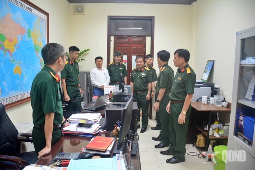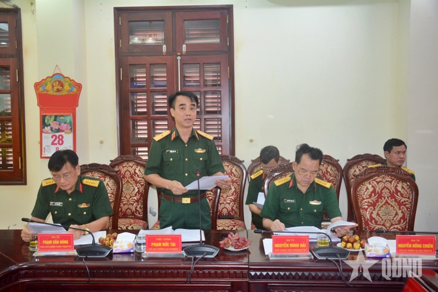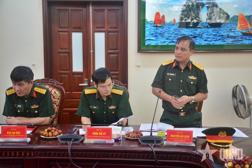 | Thiếu tướng Phạm Đức Tài báo cáo kết quả các mặt công tác với đoàn kiểm tra. |