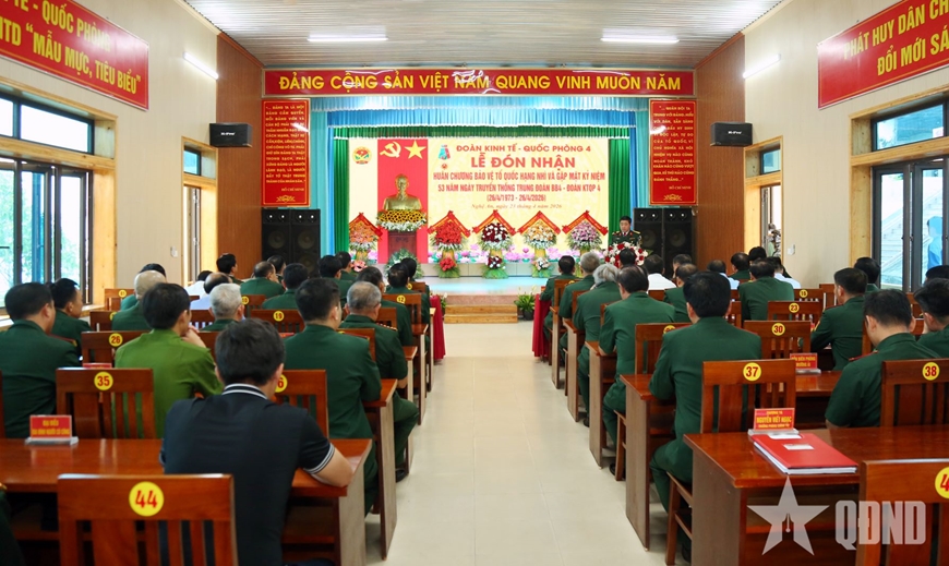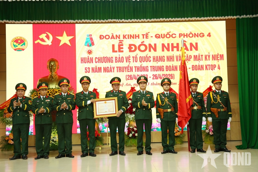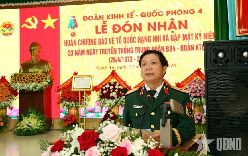 Chiều 23-4, Đoàn Kinh tế - Quốc phòng 4 tổ chức Lễ đón nhận Huân chương Bảo vệ Tổ quốc hạng Nhì và gặp mặt kỷ niệm 53 năm Ngày truyền thống đơn vị (26-4-1973 / 26-4-2026). Dự, chỉ đạo buổi lễ có Thiếu tướng Lê Văn Trung, Phó chính ủy Quân khu 4.