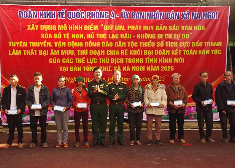 Ngày 14-11, tại Nhà Văn hóa bản Tổng Khư, xã Na Ngoi, tỉnh Nghệ An, Đoàn Kinh tế Quốc phòng 4, Quân khu 4 phối hợp với UBND xã Na Ngoi tổ chức xây dựng mô hình điểm giữ gìn, phát huy bản sắc văn hóa, xóa bỏ tệ nạn, hủ tục lạc hậu, không di cư tự do; tuyên truyền, vận động đồng bào dân tộc thiểu số tích cực đấu tranh làm thất bại âm mưu, thủ đoạn chia rẽ khối đại đoàn kết toàn dân tộc của các thế lực thù địch trong tình hình mới.