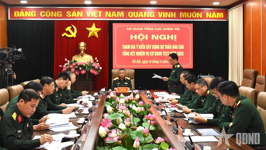 Sáng 19-11, tại Hà Nội, Tổng cục Chính trị Quân đội nhân dân (QĐND) Việt Nam tổ chức Hội nghị tham gia ý kiến xây dựng dự thảo báo cáo tổng kết nhiệm vụ Cơ quan Tổng cục Chính trị năm 2025. Thượng tướng Lê Quang Minh, Phó chủ nhiệm Tổng cục Chính trị QĐND Việt Nam chủ trì hội nghị.