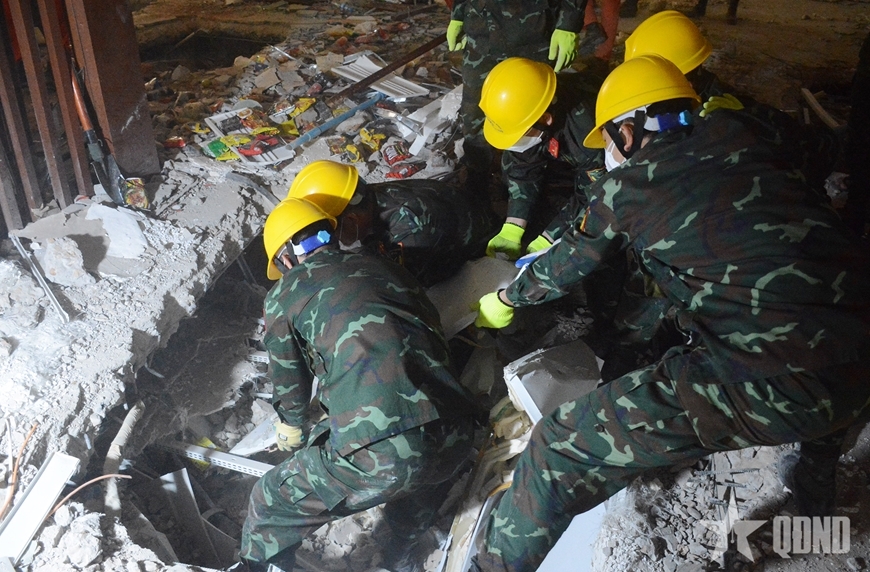 | Lực lượng cứu hộ của Quân đội nhân dân Việt Nam tìm kiếm nạn nhân tại khu vực căng tin của Bệnh viện Ottara Thiri, Thủ đô Naypyidaw của Myanmar vào đầu tháng 4-2025. Ảnh: qdnd.vn |