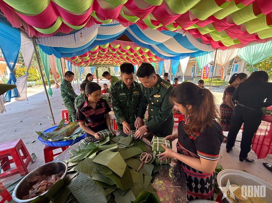 | Các cán bộ, chiến sĩ Cụm cơ động chó nghiệp vụ 4 (Trường Trung cấp 24 Biên phòng) gói bánh chưng cùng nhân dân địa phương. |