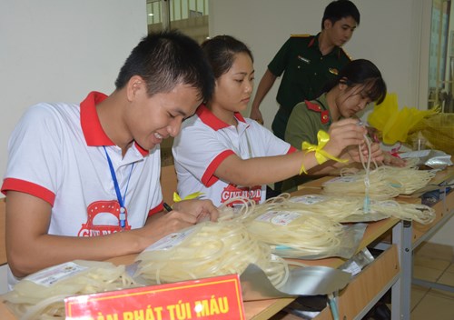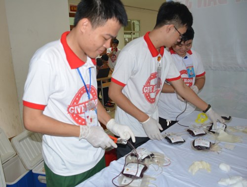 Các bạn tình nguyện viên của Học viện Quân y đang chuẩn bị những túi đựng máu.
