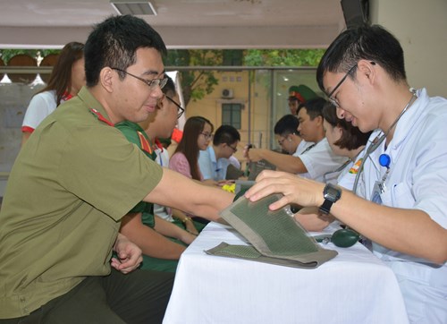 Các bác sĩ Bệnh viện Quân y 103 khám và đo huyết áp cho các học viên trước khi hiến máu.