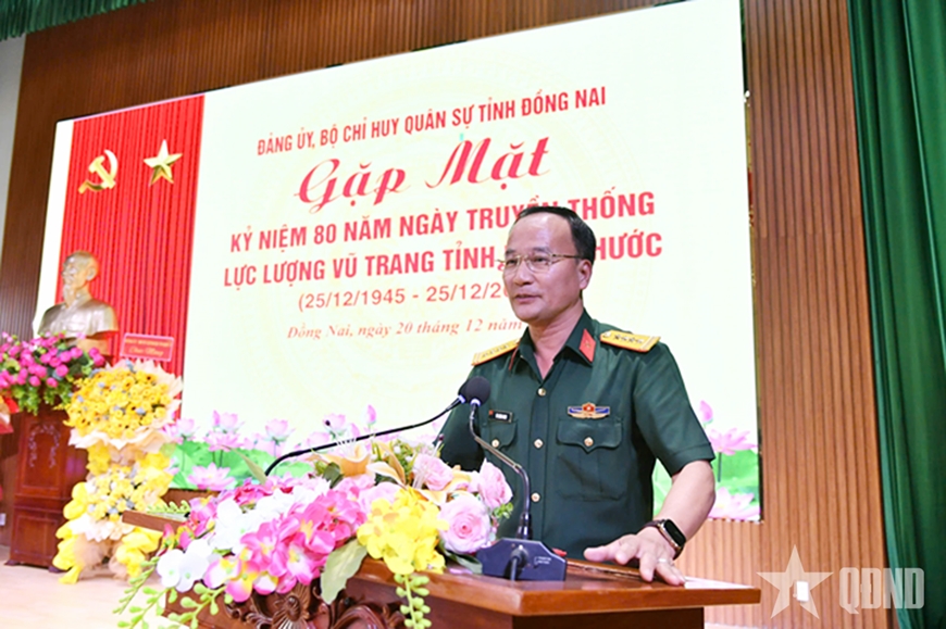 | Đại tá Võ Thành Danh, Chỉ huy trưởng Bộ CHQS tỉnh Đồng Nai trình bày diễn văn tại buổi gặp mặt. |