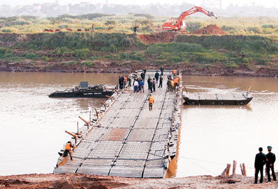 | Một đoạn cầu phao từ bờ Bắc ra bãi giữa sông Hồng được bắc xong chiều 22-11. |