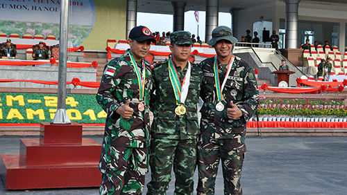 QĐND Online - 16 giờ chiều ngày 23-11, tại Trung tâm Huấn luyện Quốc gia Miếu Môn, Ban tổ chức Giải bắn súng quân dụng Quân đội các nước ASEAN lần thứ 24 (AARM-24), tổ chức trao Huy chương cho các xạ thủ bắn bài 3 đạt thành tích cao ở 5 nội dung: Súng trường, súng máy, súng cạc-bin, súng ngắn nam và súng ngắn nữ.