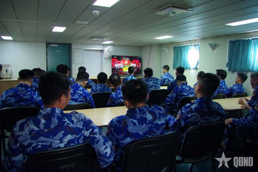| Trong quá trình thực hiện nhiệm vụ trên biển, các đơn vị vẫn tổ chức cho bộ đội theo dõi Lễ khai mạc Đại hội Đại biểu toàn quốc lần thứ XIV của Đảng. |