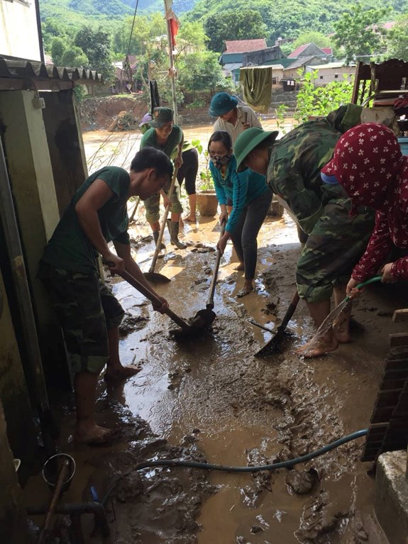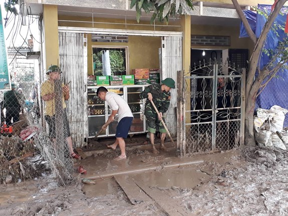 Đồn biên phòng Cửa khẩu quốc tế Nậm Cắn giúp các hộ gia đình dọn bùn đất. |