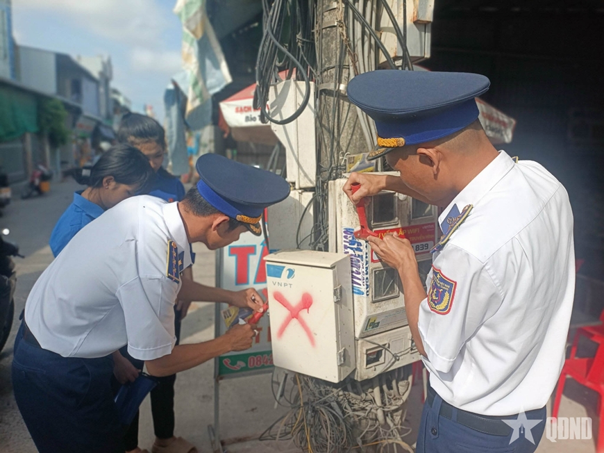 | Đoàn viên Hải đoàn 42 xóa bảng quảng cáo trên trụ điện. |