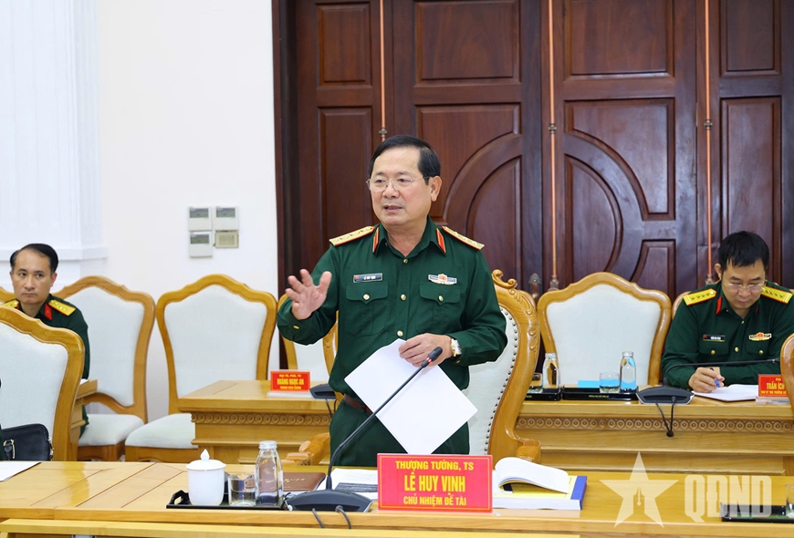 | Thượng tướng Lê Huy Vịnh trình bày kết quả nghiên cứu của đề tài. |