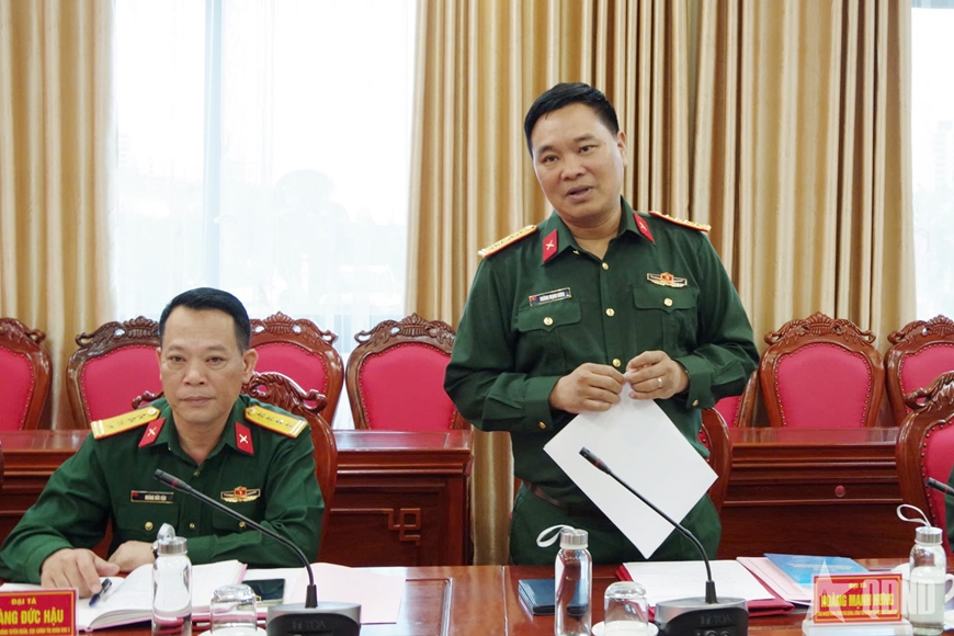 Đại tá Hoàng Mạnh Hưng, Chủ nhiệm Khoa công tác Đảng, công tác chính trị Học viện Chính trị trao đổi tại buổi làm việc.