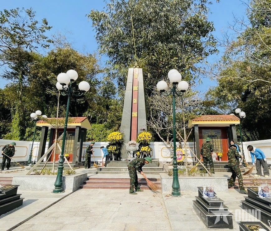 | Cán bộ, đoàn viên, thanh niên Học viện Hậu cần và xã Yên Trạch dọn dẹp vệ sinh, chỉnh trang cảnh quan Khu Di tích quốc gia - Địa điểm tổ chức Lớp Huấn luyện đầu tiên và đóng quân của Trường Cán bộ Cung cấp. |