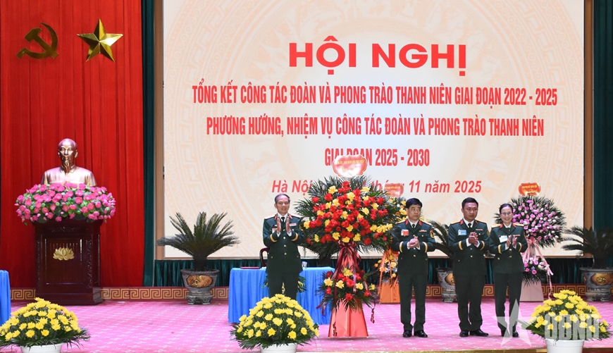 | Lãnh đạo Ban Thanh niên Quân đội tặng hoa chúc mừng hội nghị. |