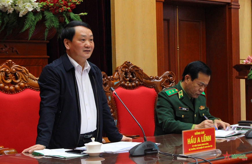 | Đồng chí Hầu A Lềnh, Ủy viên Trung ương Đảng, Bộ trưởng, Chủ nhiệm UBDT nhấn mạnh kết quả của Chương trình phối hợp giữa UBDT và Bộ tư lệnh BĐBP trong thời gian qua. |