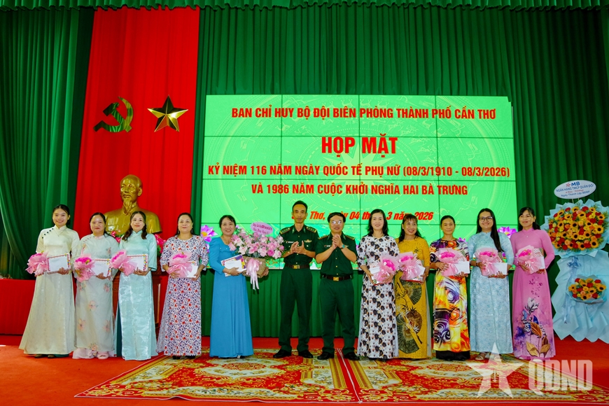Chiều 4-3, Ban chỉ huy Bộ đội Biên phòng (BĐBP) TP Cần Thơ tổ chức họp mặt kỷ niệm 116 năm Ngày Quốc tế Phụ nữ (8-3-1910 / 8-3-2026) và 1.986 năm cuộc khởi nghĩa Hai Bà Trưng. Đại tá Hà Huy Trường, Phó chính ủy BĐBP TP Cần Thơ chủ trì buổi họp mặt.
