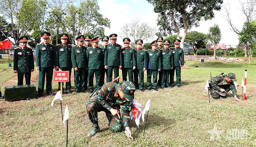 | Thiếu tướng Tô Thành Quyết, Phó tư lệnh Quân khu 3 cùng các đại biểu tham quan cán bộ, chiến sĩ Lữ đoàn 513 thực hiện rà phá bom, mìn, vật nổ. |