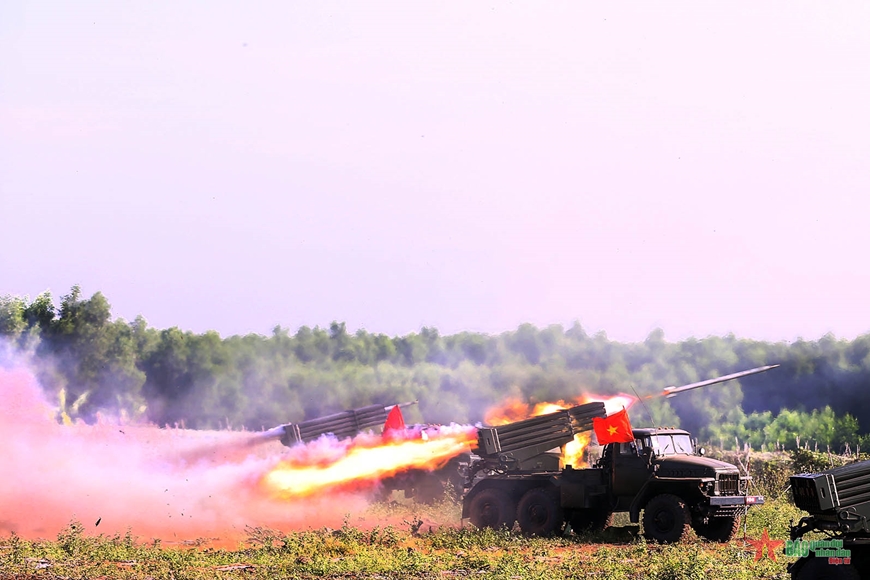 | Pháo binh của Lữ đoàn 434, Quân đoàn 4 tiêu diệt mục tiêu trong diễn tập năm 2022. |