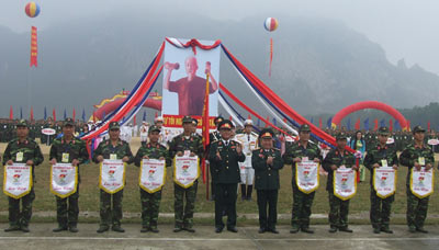 Đại tướng Lê Văn Dũng, Thượng tướng Nguyễn Khắc Nghiên tặng cờ và chụp ảnh với các đoàn trưởng