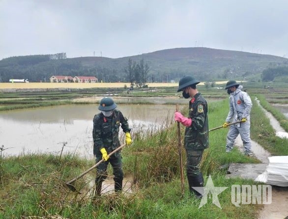 | Cán bộ, chiến sĩ Phân kho 85 tích cực khắc phục hậu quả. Ảnh: ĐỨC MINH |