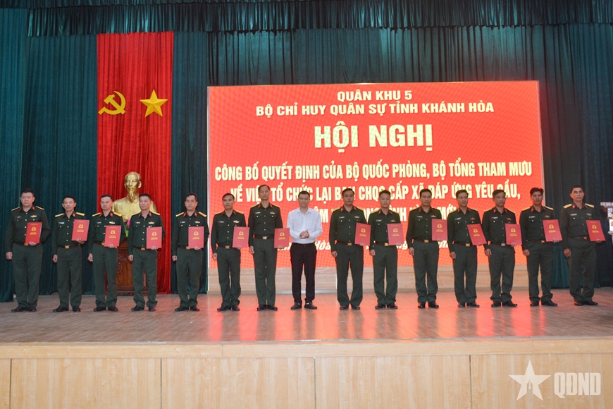 Tại hội nghị, đại diện Bộ CHQS tỉnh Khánh Hòa đã công bố Quyết định của Bộ Quốc phòng về tổ chức lại Ban CHQS cấp xã, phường, đặc khu; công bố Quyết định của Chủ tịch UBND tỉnh Khánh Hòa về miễn nhiệm chức vụ Chỉ huy trưởng Ban CHQS xã, phường.