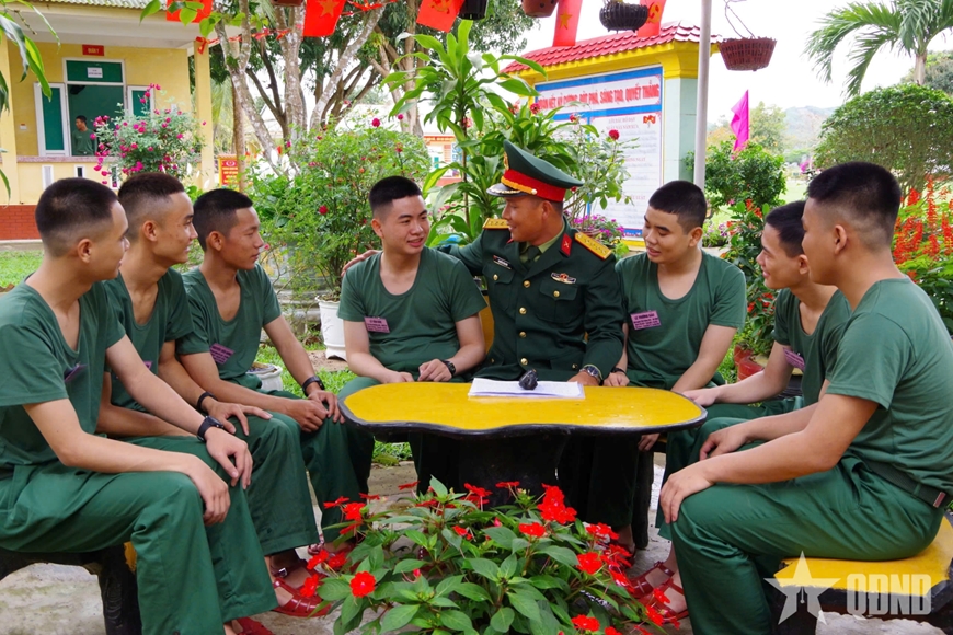 Chỉ huy đại đội nắm tình hình tư tưởng và động viên chiến sĩ mới trong ngày đầu.