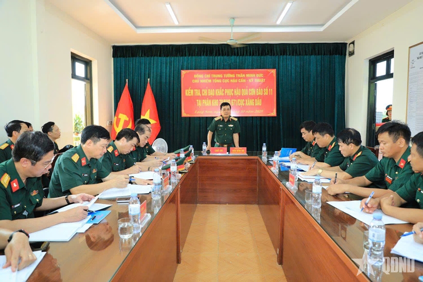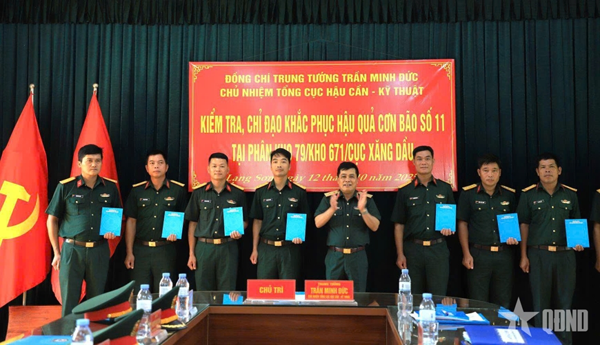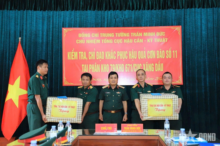 Trung tướng Trần Minh Đức, Chủ nhiệm Tổng cục Hậu cần-Kỹ thuật chỉ đạo công tác khắc phục hậu quả cơn bão số 11 tại Phân kho 79. |