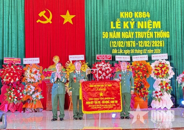 Cũng tại lễ kỷ niệm, Thiếu tướng Nguyễn Đình Chiêu trao Cờ lưu niệm của Tổng cục Hậu cần - Kỹ thuật tặng Kho K864.