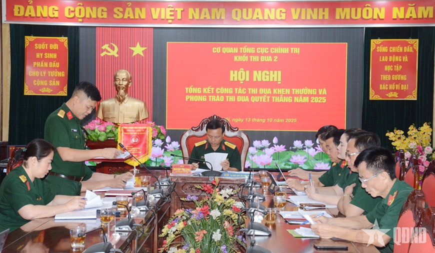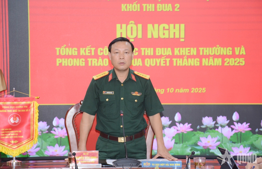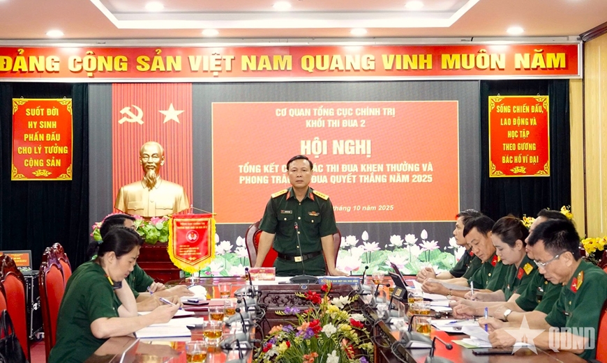 Báo cáo tại hội nghị đánh giá, năm 2025, công tác TĐKT và PTTĐ Quyết thắng trong Khối thi đua số 2 Cơ quan Tổng cục Chính trị được cấp ủy, chỉ huy các cơ quan quan tâm lãnh đạo, chỉ đạo, tổ chức triển khai thực hiện nghiêm túc, toàn diện, đồng bộ, có trọng tâm, trọng điểm, bám sát thực tiễn và nhiệm vụ chính trị được giao.
