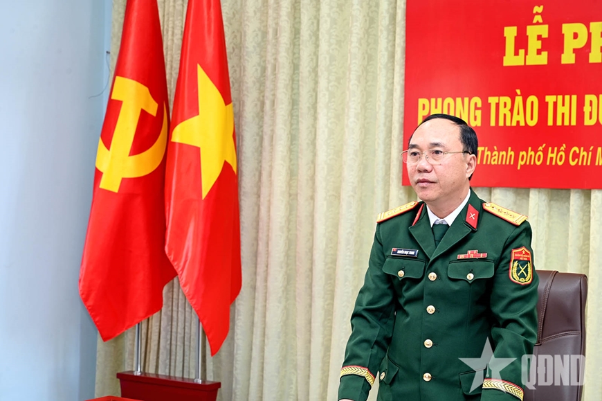 | Đại tá Nguyễn Ngọc Thanh phát biểu tại lễ phát động thi đua. |