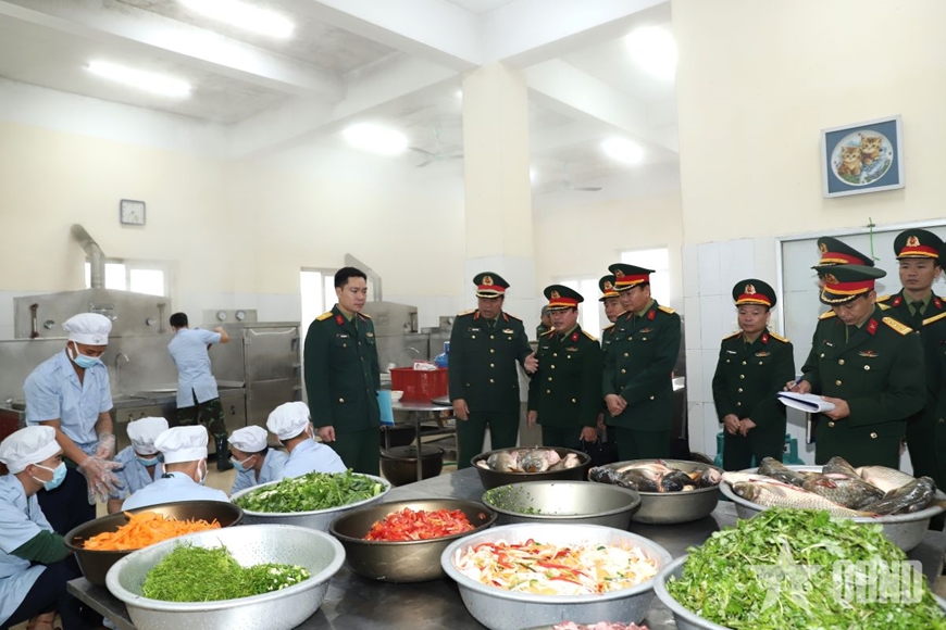 | Đoàn công tác kiểm tra sơ chế thực phẩm tại bếp ăn của lực lượng Quân khu 2 tại Trung tâm Huấn luyện Quốc gia 4. |