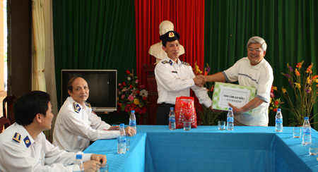 Thượng tá Ngô Bình Minh - Phó Chỉ huy trưởng, Tham mưu trưởng Vùng Cảnh sát Biển 1 tặng quà cho nhân dân huyện đảo Cồn Cỏ (Quảng Trị).