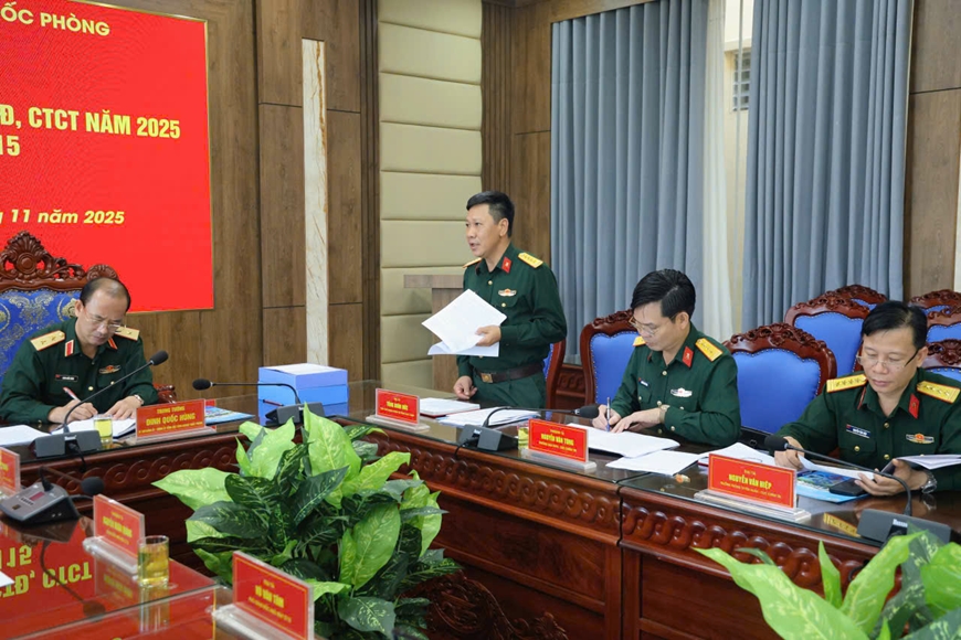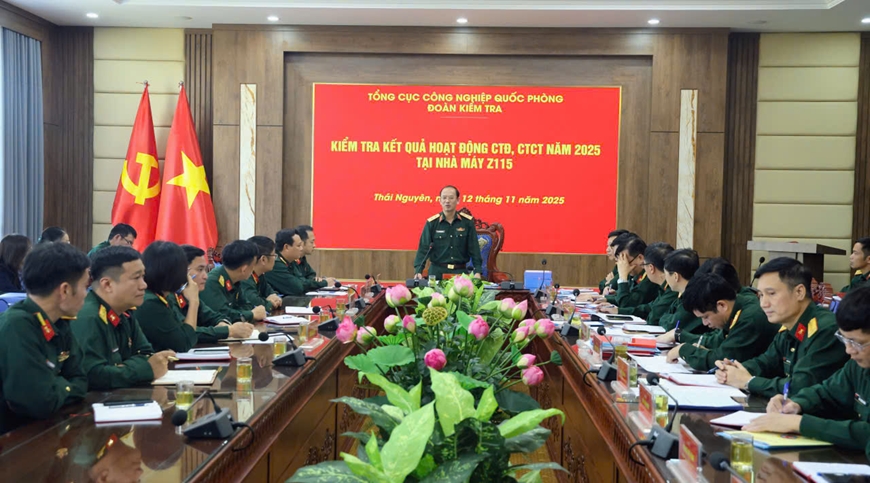 | Đại tá Tống Xuân Đức, Phó chủ nhiệm Chính trị Tổng cục Công nghiệp Quốc phòng báo cáo kết quả kiểm tra công tác Đảng, công tác chính trị tại Nhà máy Z115. |