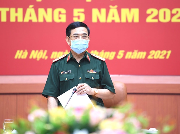 Phát biểu kết luận hội nghị, Thượng tướng Phan Văn Giang đã nhấn mạnh, làm sâu sắc hơn những kết quả đạt được của toàn quân trong tháng 5-2021; ghi nhận, biểu dương cán bộ, chiến sĩ các cơ quan, đơn vị đã chủ động khắc phục khó khăn, tích cực tổ chức thực hiện và hoàn thành tốt các nhiệm vụ được giao. Cùng với nêu lên các giải pháp lớn mang tính định hướng, nhằm thực hiện và hoàn thành toàn diện các nhiệm vụ của tháng 6-2021, đồng chí Bộ trưởng Bộ Quốc phòng nhấn mạnh một số nội dung quan trọng, đó là: Bộ Quốc phòng và các cơ quan chức năng cần chỉ đạo các đơn vị tiếp tục duy trì nghiêm chế độ trực SSCĐ, nắm chắc, dự báo đúng tình hình, tham mưu xử lý kịp thời các tình huống, không để bị động, bất ngờ; tiếp tục hoàn chỉnh các đề án, kế hoạch về tổ chức lực lượng, trang bị; chỉ đạo tổ chức huấn luyện và chuẩn bị diễn tập đúng kế hoạch, bảo đảm chất lượng. Cùng với đó, Bộ Quốc phòng tiếp tục tăng cường chỉ đạo toàn quân đẩy mạnh công tác giáo dục chính trị, tư tưởng, động viên bộ đội khắc phục khó khăn, đề cao quyết tâm, trách nhiệm, sẵn sàng nhận và hoàn thành mọi nhiệm vụ được giao. Hoạt động đối ngoại quốc phòng và hợp tác quốc tế tiếp tục triển khai theo đúng kế hoạch. Công tác hậu cần, kỹ thuật phải bảo đảm đầy đủ, kịp thời cho các nhiệm vụ thường xuyên cũng như đột xuất. Bên cạnh thực hiện các nhiệm vụ nói trên, toàn quân cần tích cực tổ chức các biện pháp PCD Covid-19, bảo đảm an toàn đơn vị, bảo vệ sức khỏe bộ đội; đồng thời chủ động, tích cực giúp đỡ các địa phương PCD; kiên quyết không để dịch Covid-19 gây ảnh hưởng đến tiến độ, chất lượng huấn luyện và khả năng SSCĐ của quân đội.