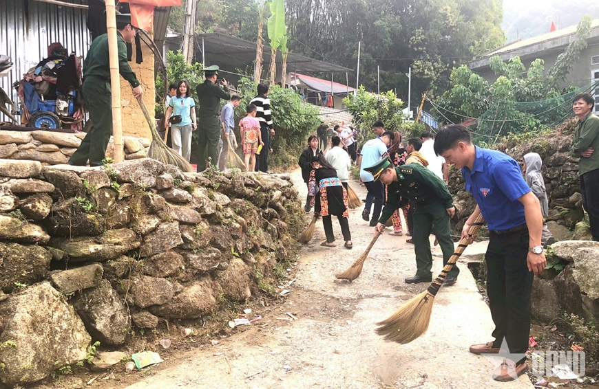 | Đoàn viên, thanh niên và cán bộ, chiến sĩ BĐBP ra quân dọn dẹp vệ sinh môi trường khu vực biên giới. |
