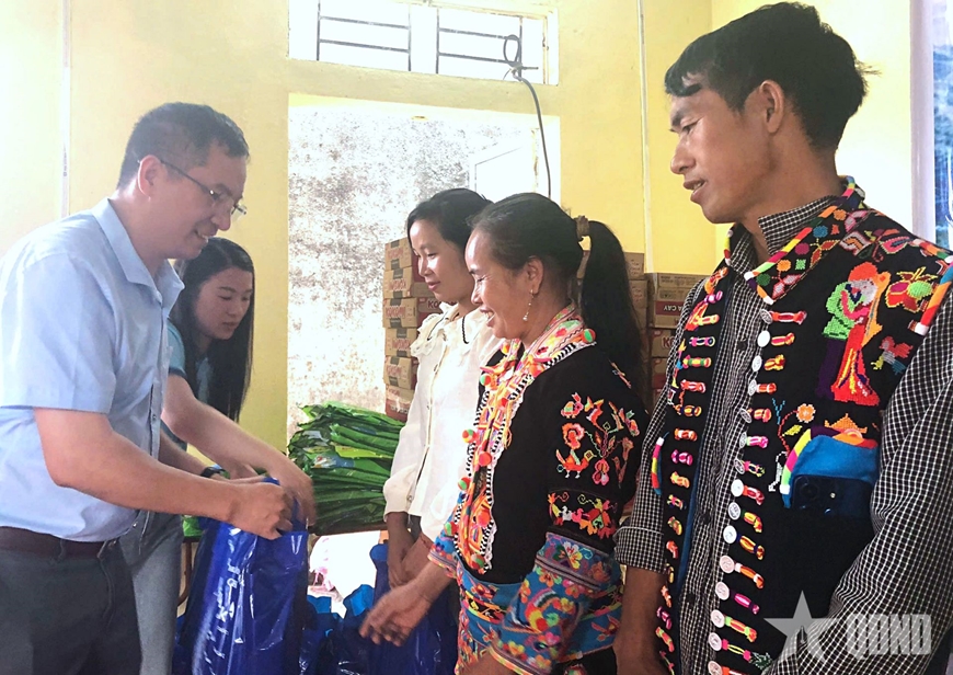 | Đại diện các đơn vị trao quà hỗ trợ các hộ dân có hoàn cảnh khó khăn tại khu vực biên giới. |