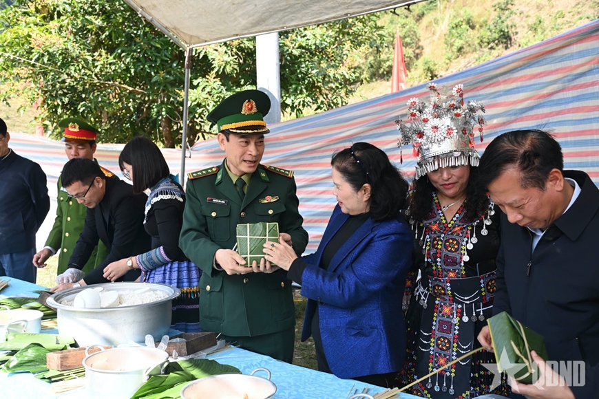 Các đại biểu dự Chương trình “Xuân Biên phòng ấm lòng dân bản” tại bản Pa Mu tham gia gói bánh chưng cùng đồng bào.